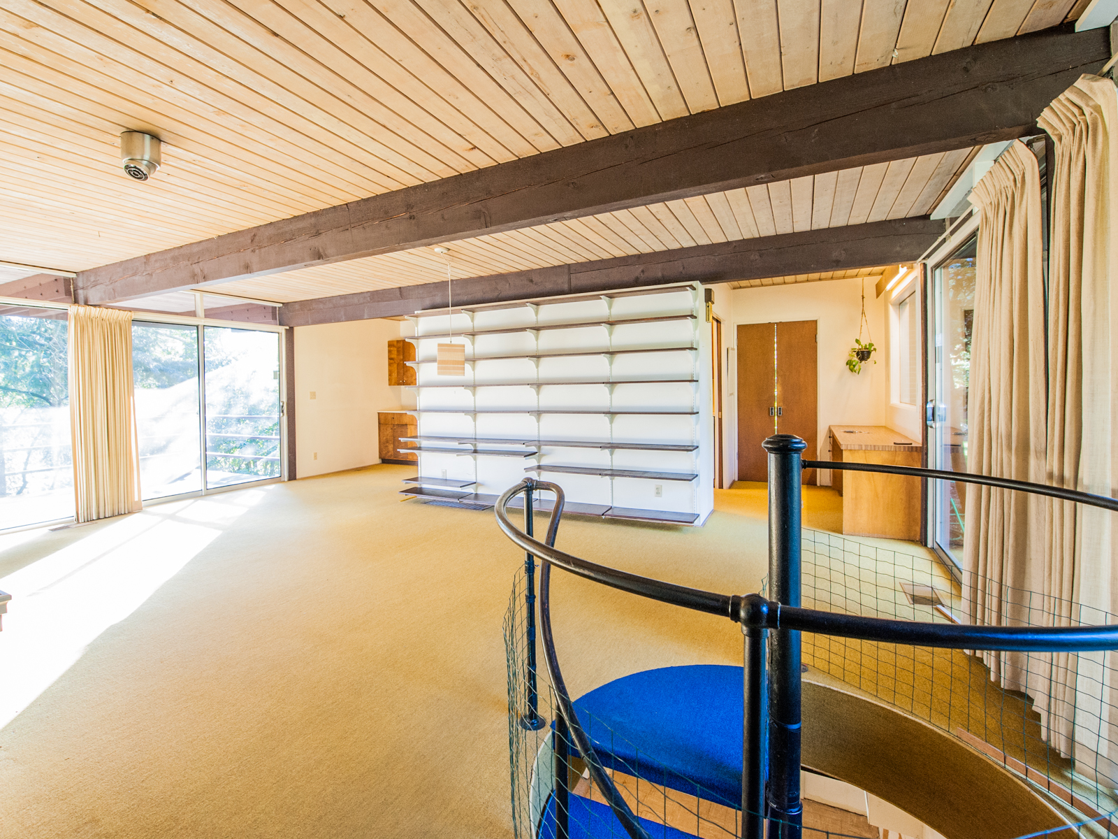 Designed in 1958 by Architect Frank Shell, this one-owner, original mid-century modern home boasts post & beam construction with floor-to-ceiling windows on both levels, a 16×24 great-room with fireplace, a family room with cantilevered deck, 4 bedrooms with either balcony or garden access, 3 full baths, an easily accessed laundry area, a 2-car attached garage, and additional storage bay. Large private .25 acre lot with mature landscaping and second 17×7 ‘boat-house’ garage. Updates include: welded-seam roof w/ 6″ of insulation, double-pane windows, gas furnace.